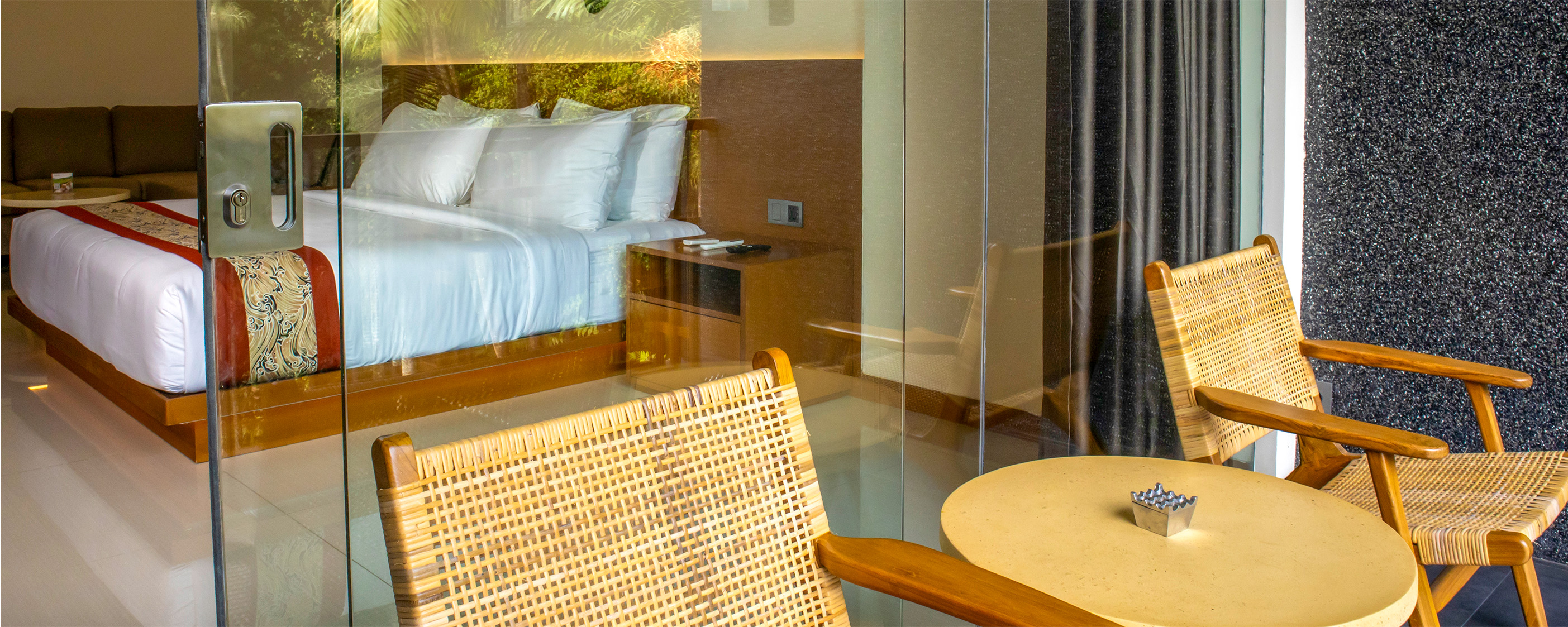 Suite Room is a lavish retreat designed for ultimate comfort and relaxation. Featuring a king-size bed and a modern tropical room design, this suite offers a sophisticated ambiance. Large glass rolling doors lead to a spacious balcony, providing breathtaking views of the meticulously landscaped gardens. Additionally, the Suite Room includes a cozy living room area, perfect for unwinding or entertaining. Complete with a private jacuzzi and a convenient coffee machine, the Suite Room ensures that every moment is a pleasure, combining luxury and convenience for an unforgettable stay.